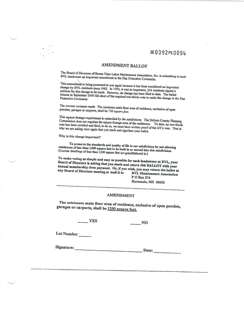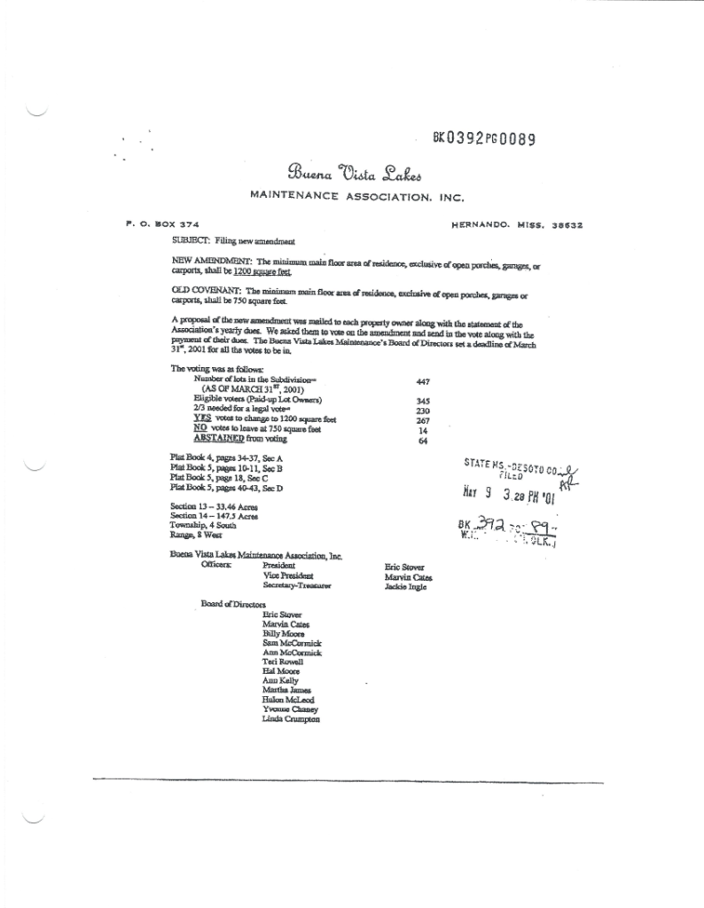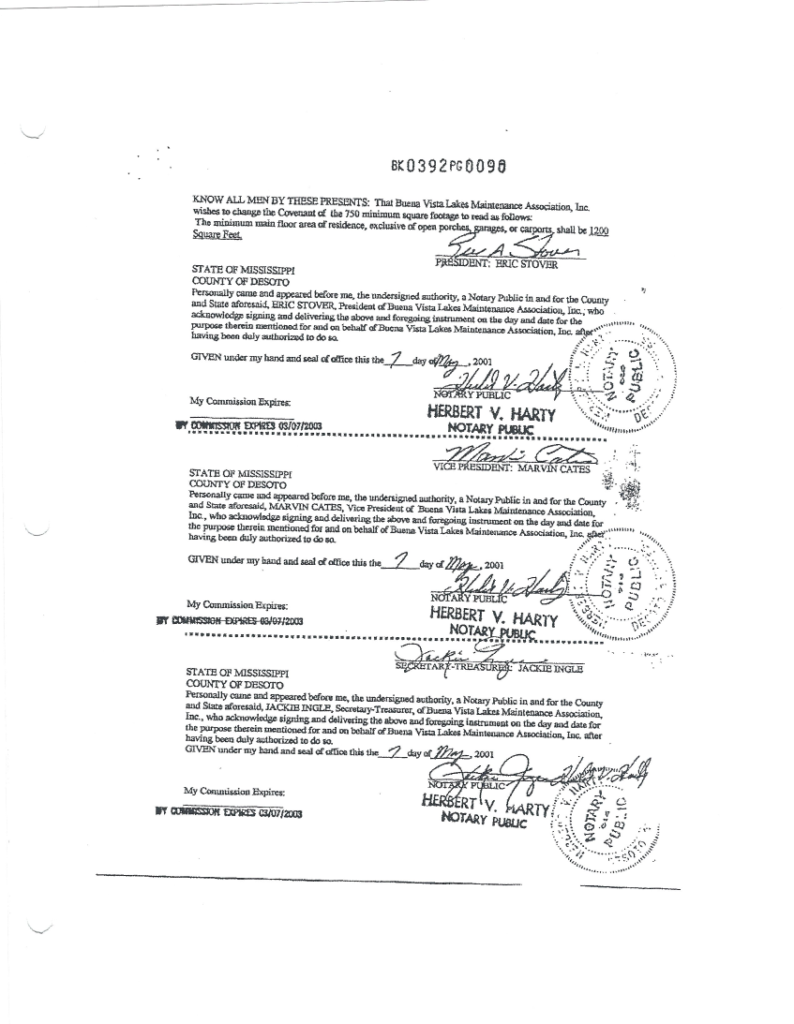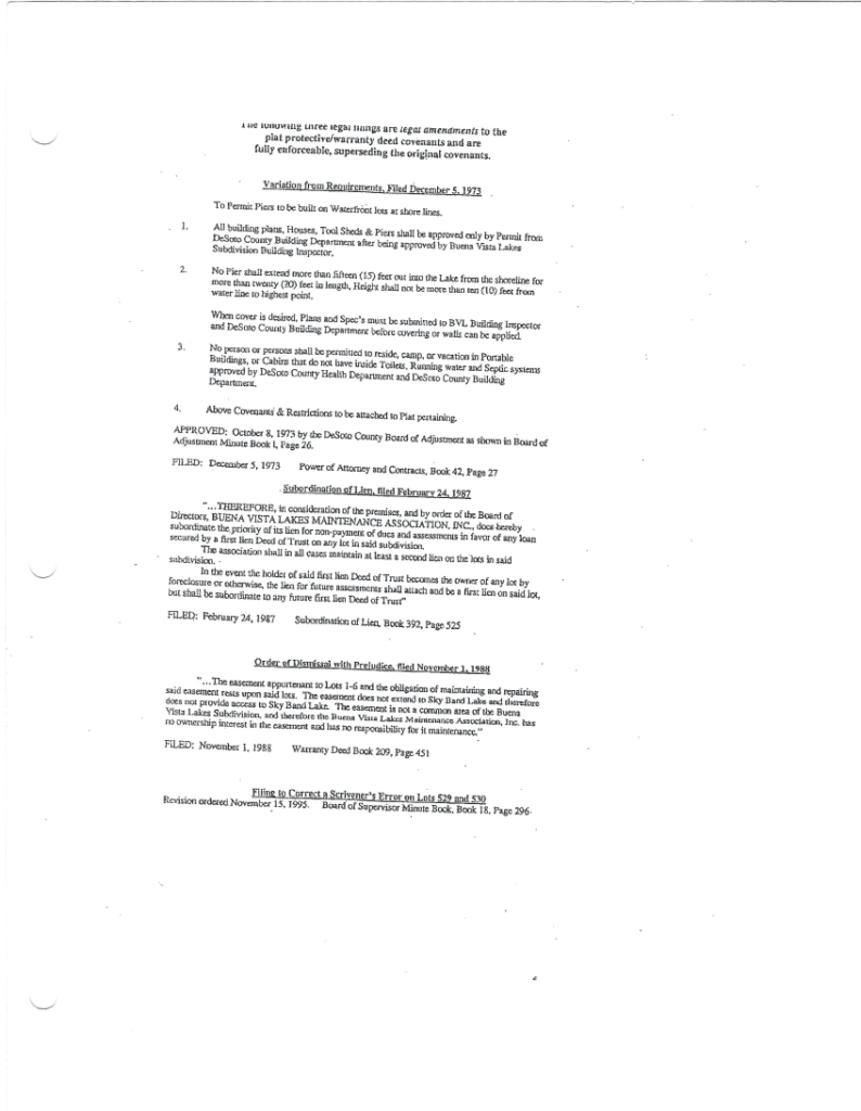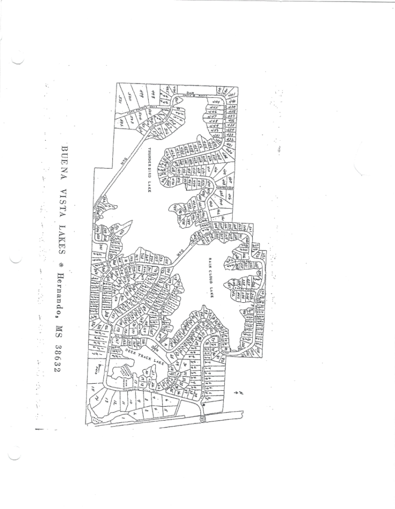 Buena Vista Lakes Subdivision Plat as recorded in the Office of the Chancery Court Clerk, DeSoto County, Mississippi, in Plat Book 4, pages 34-37 (Section A), Plat Book 5, pages 10-11 (Section B), Plat Book 5, page 18 (Section C), Plat Book 5, pages 40-43 (Section D). These Plat Covenants cannot be changed until 1991.